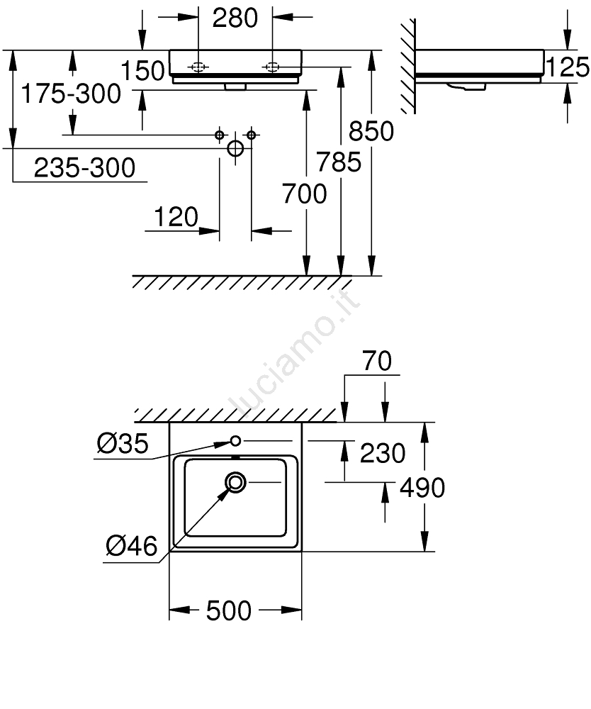 • Dimensioni 500 × 490 mm, ideale per bagni di piccole dimensioni.
