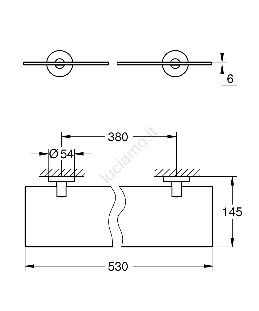 • Lunghezza 530 mm con lunghezza utile di 380 mm che offre spazio sufficiente per gli accessori da bagno.