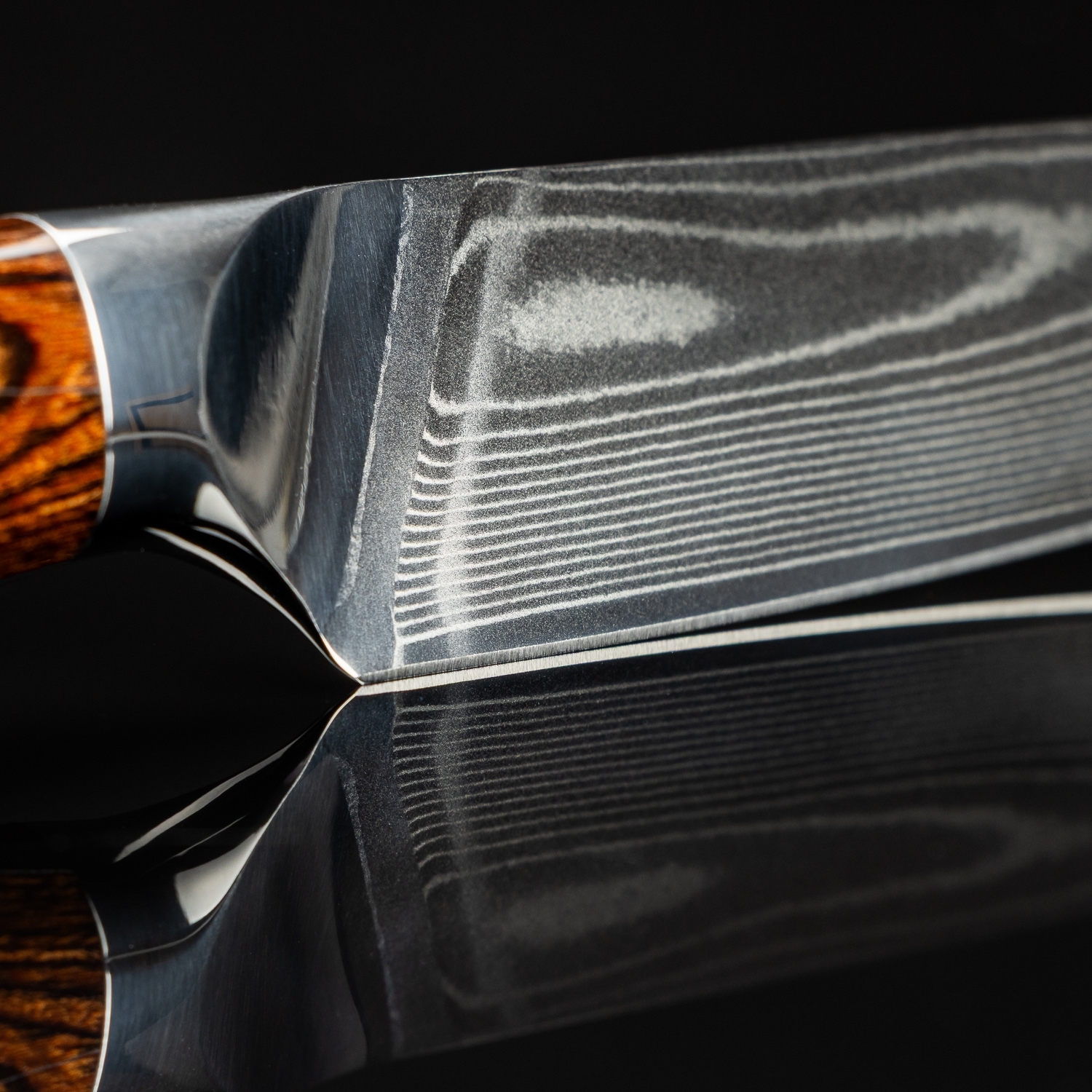 • La lama lunga 200 mm è realizzata con 67 strati di acciaio damasco con nucleo in VG10 – acciaio giapponese premium noto per la sua eccellente durezza, resistenza e lunga tenuta del filo.