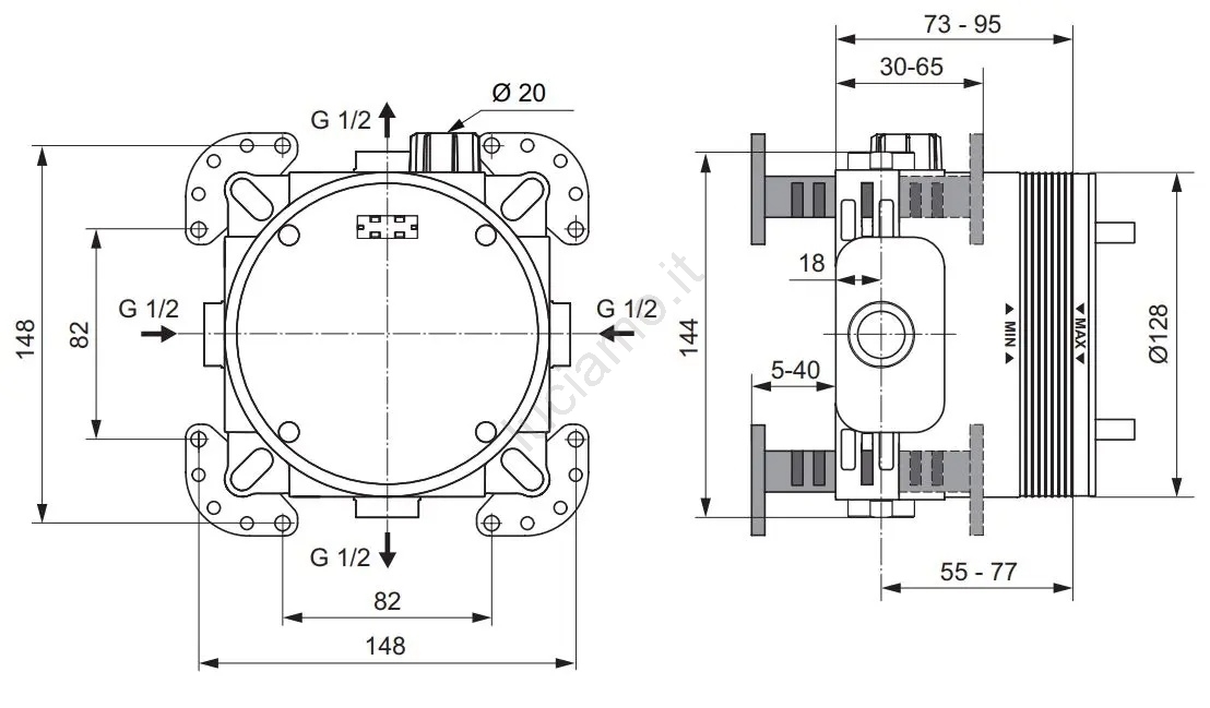 • La profondità totale di installazione varia da 73 a 95 mm, con una profondità regolabile da 5 a 40 mm.
