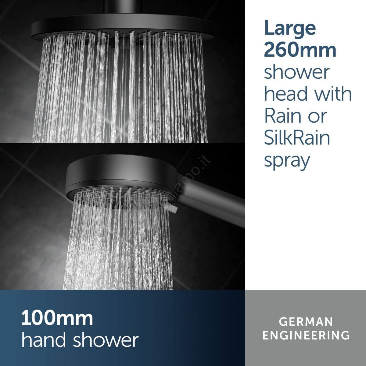 • Il soffione di diametro 260 mm offre due getti (SilkRain e Rain), selezionabili tramite manopola centrale.