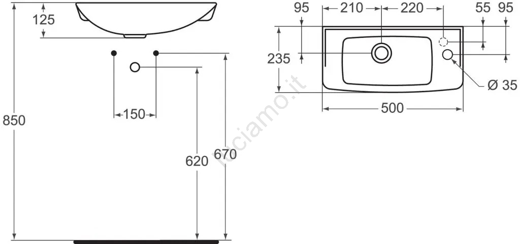 • Il lavabo dispone di un foro predisposto per l'installazione del miscelatore, posizionato sul lato destro.
