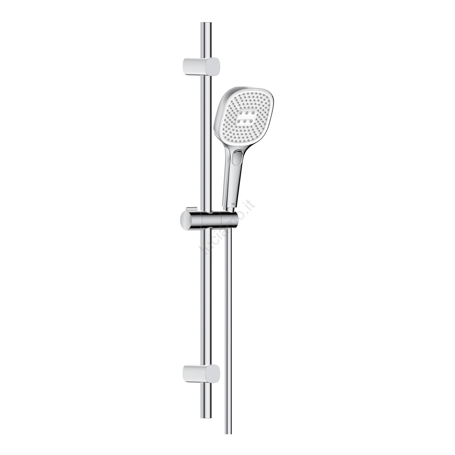 • La confezione contiene: asta doccia, supporti a parete - 2 pezzi (compreso 1 supporto con possibilità di adattare la posizione ai fori esistenti), kit di montaggio (2 viti con tasselli), doccetta a mano con manico, tubo in PVC (L=1500 mm).