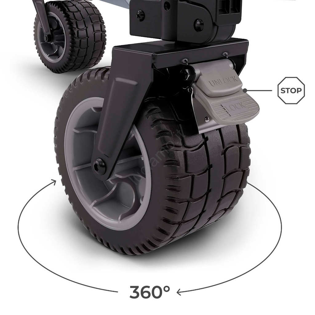 • Le grandi ruote fuoristrada in PVC, larghe 10 cm, affrontano facilmente sabbia, erba e ghiaia, mantenendo il carrello stabile anche su superfici irregolari.