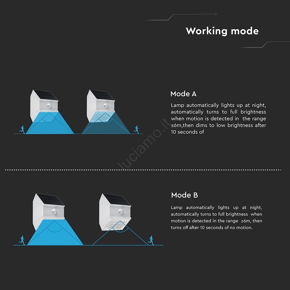 • Lampada solare da parete con sensore, LED 2,5W/3,7V, 3000/4000/6000K, IP65, 1200 mAh, bianca
