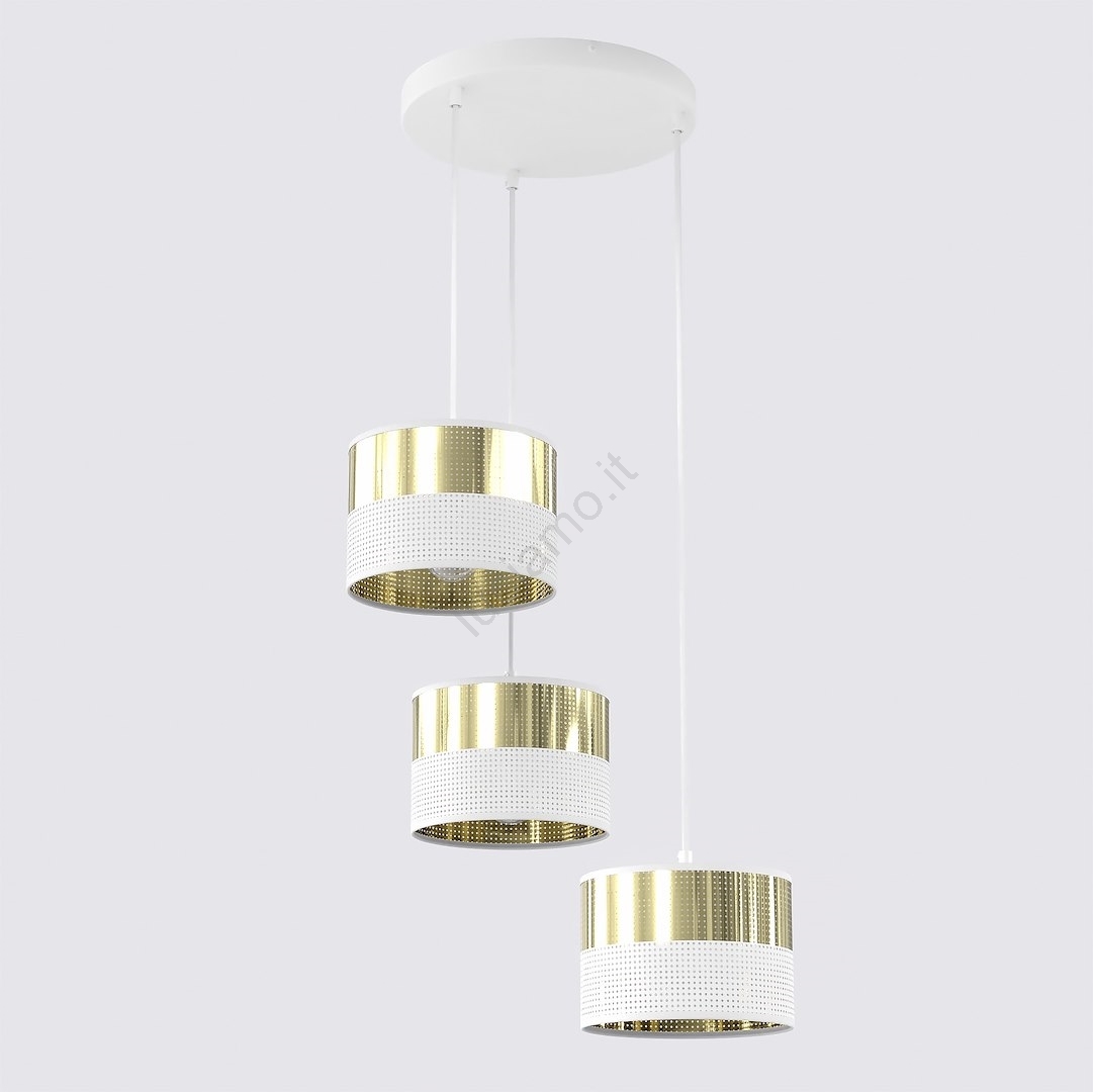 Lampadario a sospensione con cavo LUX 3xE27/15W/230V bianco/oro caratterizza un design gradevole e funzionale. Per la lampada è adatta una lampadina con attacco E27. Qui puoi acquistare altre lampadine a prezzi vantaggiosi. Avrai un'aggiunta interessante alla tua casa.