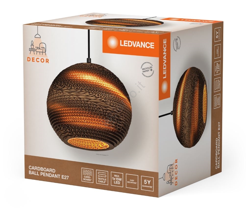 Ledvance - Lampadario a sospensione con filo DECOR CARDBOARD 1xE27/15W/230V diametro 26 cm caratterizza un design gradevole e funzionale. Per la lampada è adatta una lampadina con attacco E27. Qui puoi acquistare altre lampadine a prezzi vantaggiosi. Avrai un'aggiunta interessante alla tua casa.