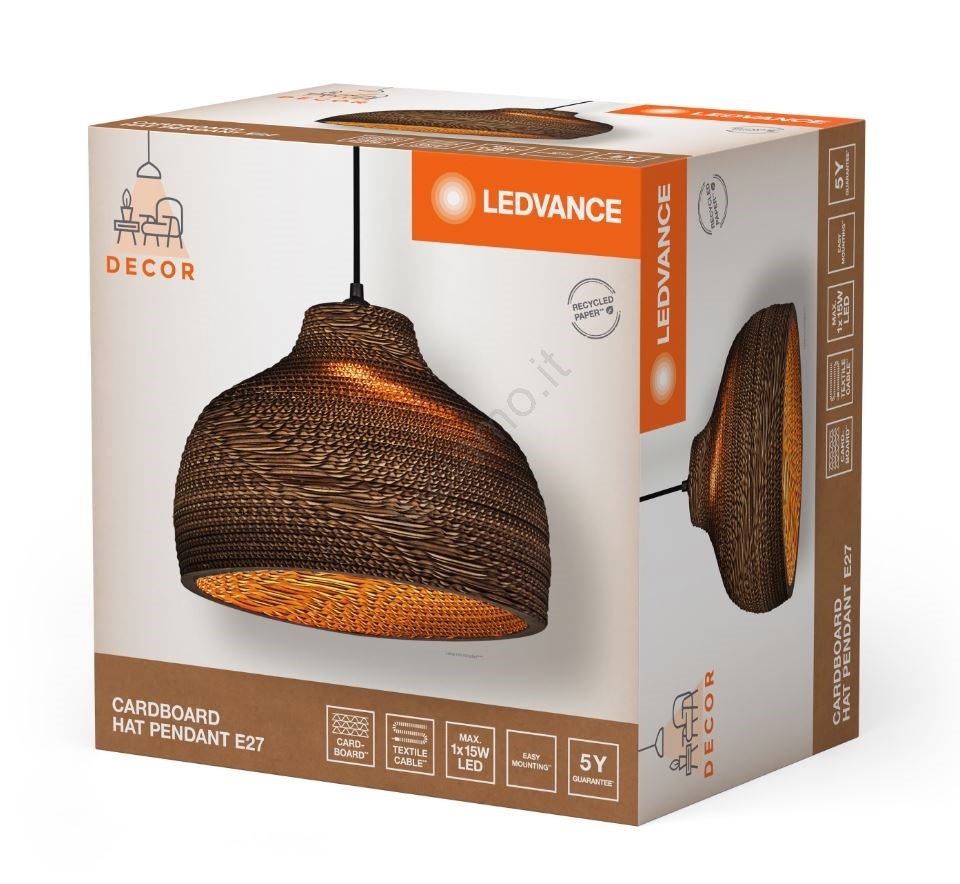 Ledvance - Lampadario a sospensione con filo DECOR CARDBOARD 1xE27/15W/230V diametro 36 cm caratterizza un design gradevole e funzionale. Per la lampada è adatta una lampadina con attacco E27. Qui puoi acquistare altre lampadine a prezzi vantaggiosi. Avrai un'aggiunta interessante alla tua casa.