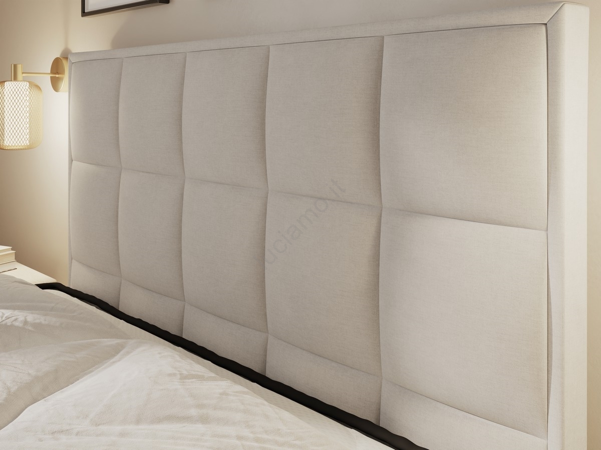 • Grazie alla testiera alta con impunture a quadri, al materasso soffice e al telaio basso e interamente rivestito, il letto dona un'atmosfera molto accogliente e al contempo sofisticata.