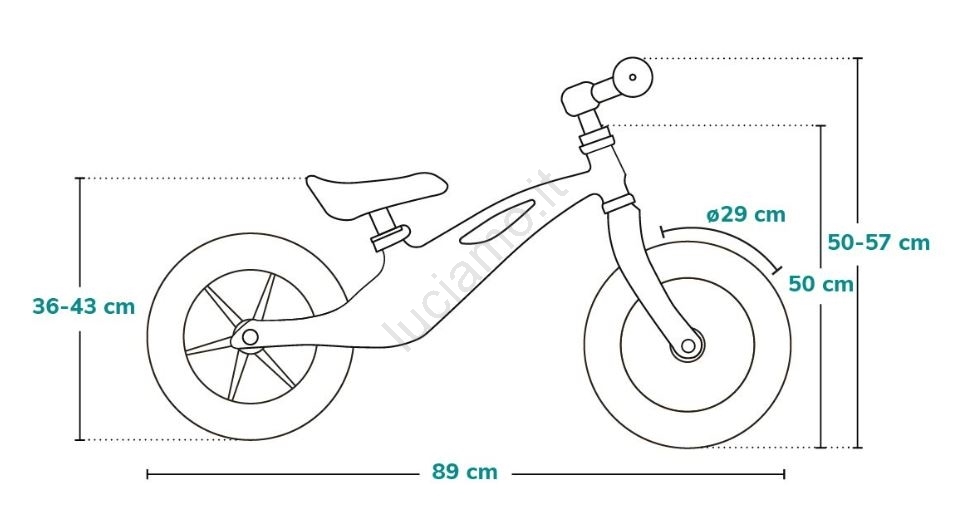• Manubrio regolabile in altezza (50 - 57 cm) e sella (36 - 43 cm) garantiscono un adattamento completo per bambini fino a 6 anni.