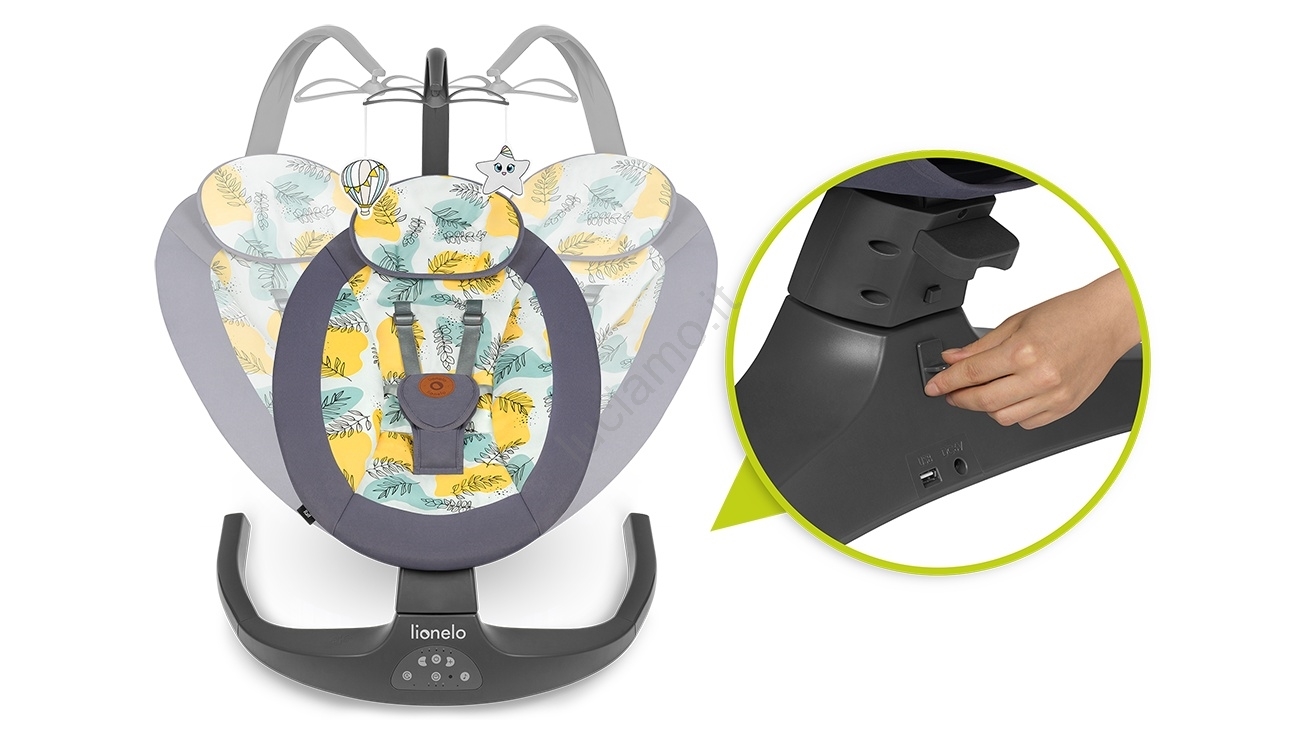 • Movimento laterale, 5 velocità di dondolio, timer (8, 15, 30 min).