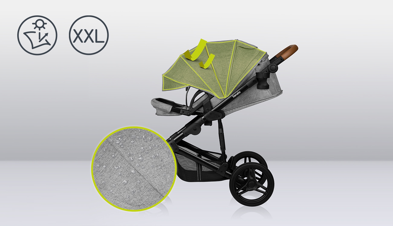 • Materasso spesso con rivestimento in cotone, capottina XXL impermeabile con protezione UPF50+.