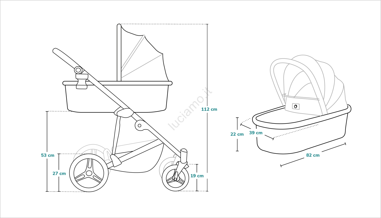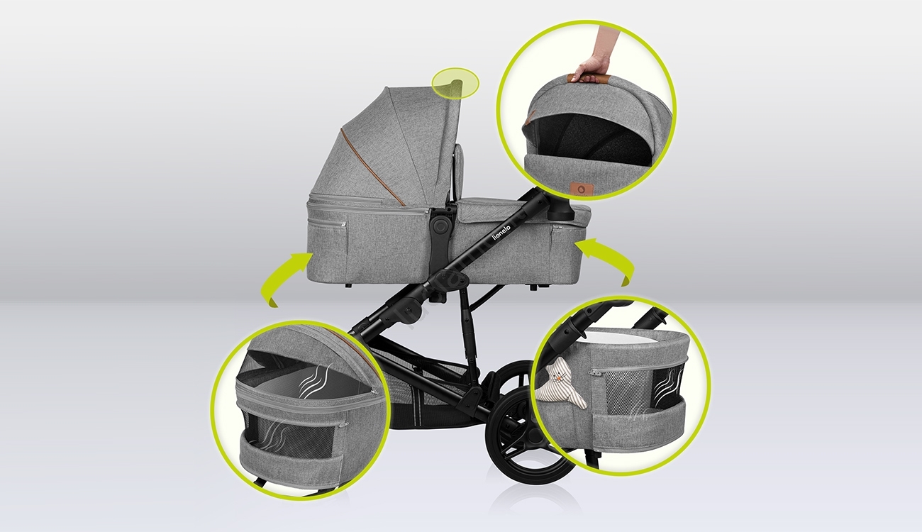 • Passeggino 2 in 1 – navicella e seduta sportiva, dalla nascita fino a circa 4 anni (navicella fino a 9 kg, seduta sportiva fino a 22 kg).