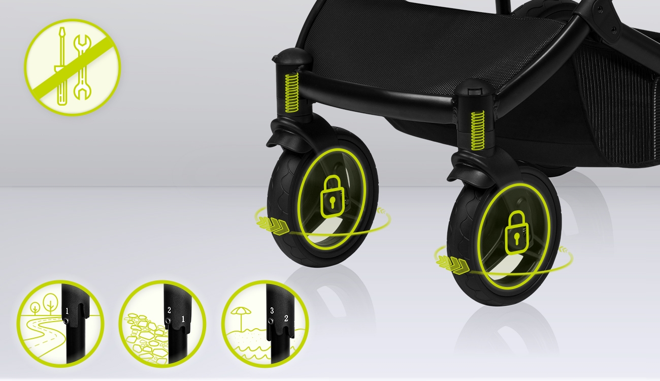 • Grandi ruote off-road senza manutenzione (27 cm, larghezza 5 cm) con battistrada profondo, ruotabili a 360° con bloccaggio, ammortizzatori centrali con 3 livelli di durezza.