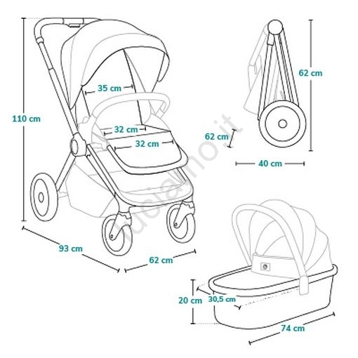 • Ricco kit di accessori: copertura per le gambe, zanzariera, copertura antipioggia, adattatori per seggiolino auto.