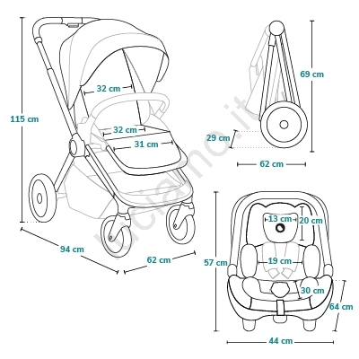 • Navicella spaziosa, richiudibile, altezza regolabile tramite adattatori, rivestimento apribile su entrambi i lati.