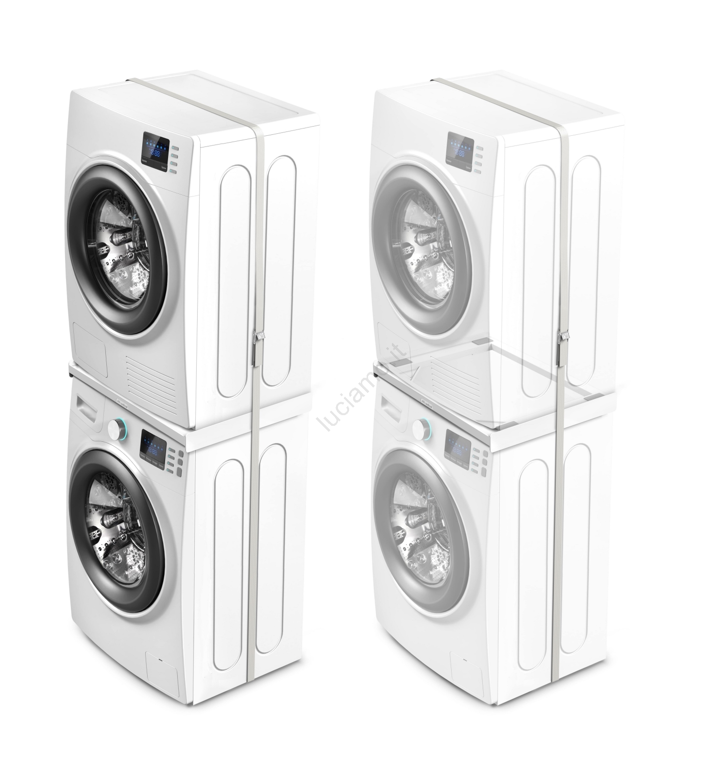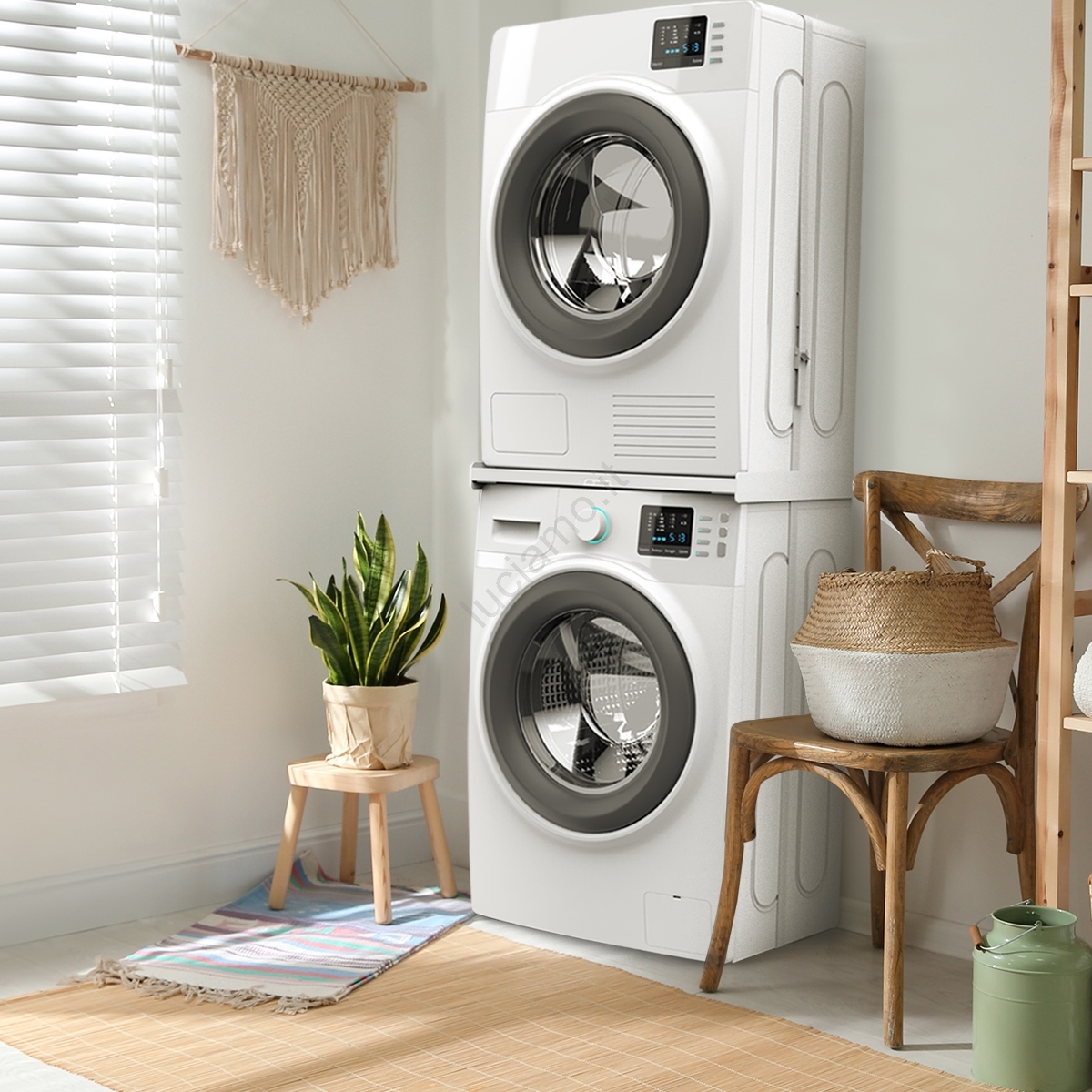 • Il distanziale è progettato per l'impilamento sicuro di lavatrice e asciugatrice, ottimizzando notevolmente lo spazio in casa.