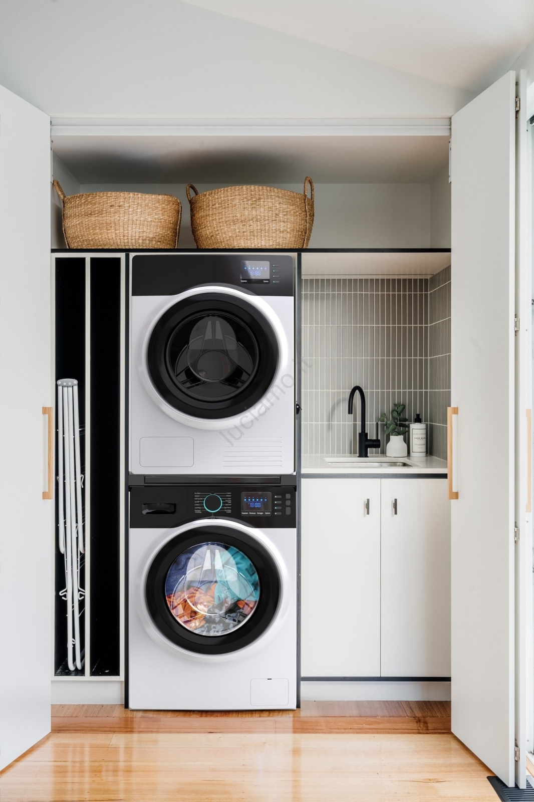 • Kit di collegamento universale per lavatrici con profondità 45–70 cm e asciugatrici a carica frontale.