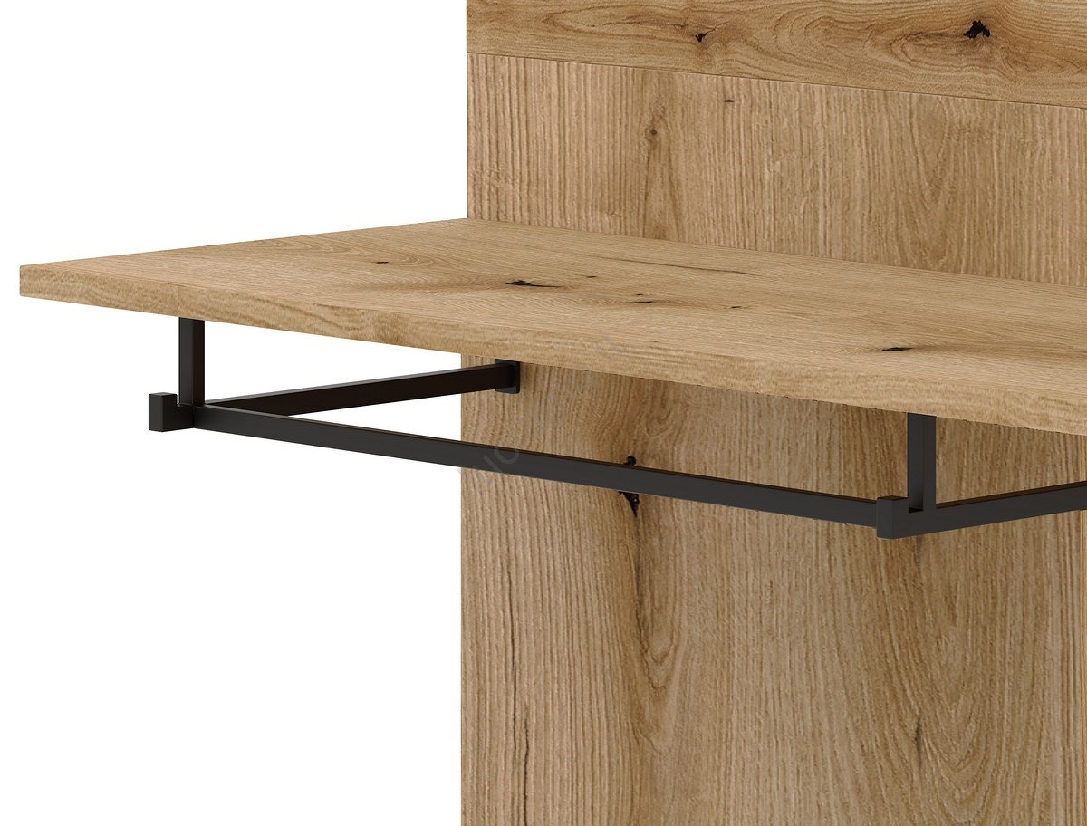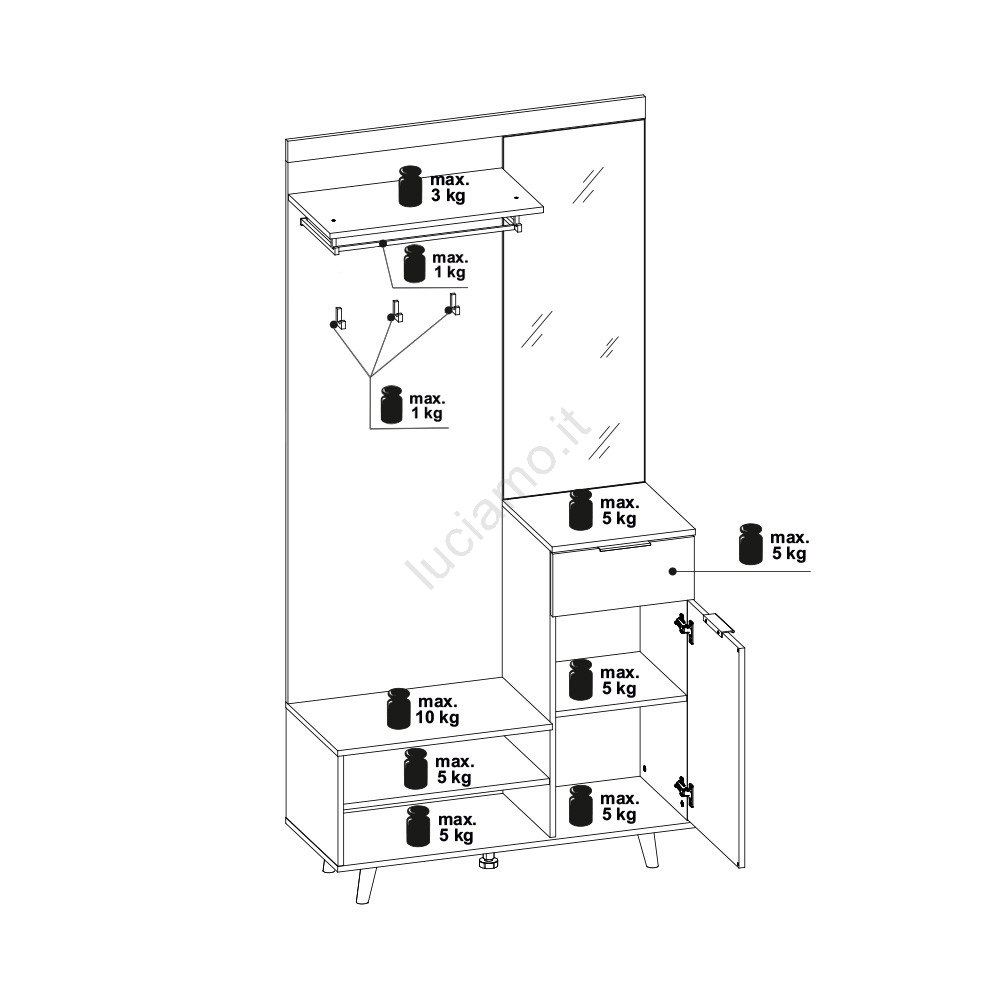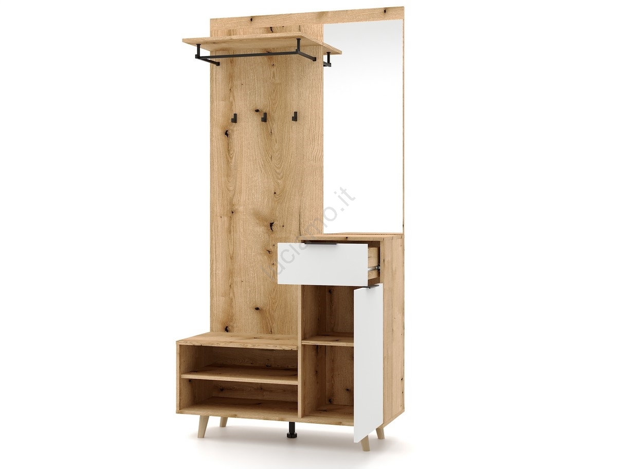 • Sotto di esso si trovano diversi scomparti chiusi e ripiani aperti per scarpe, accessori o altri oggetti di uso quotidiano.