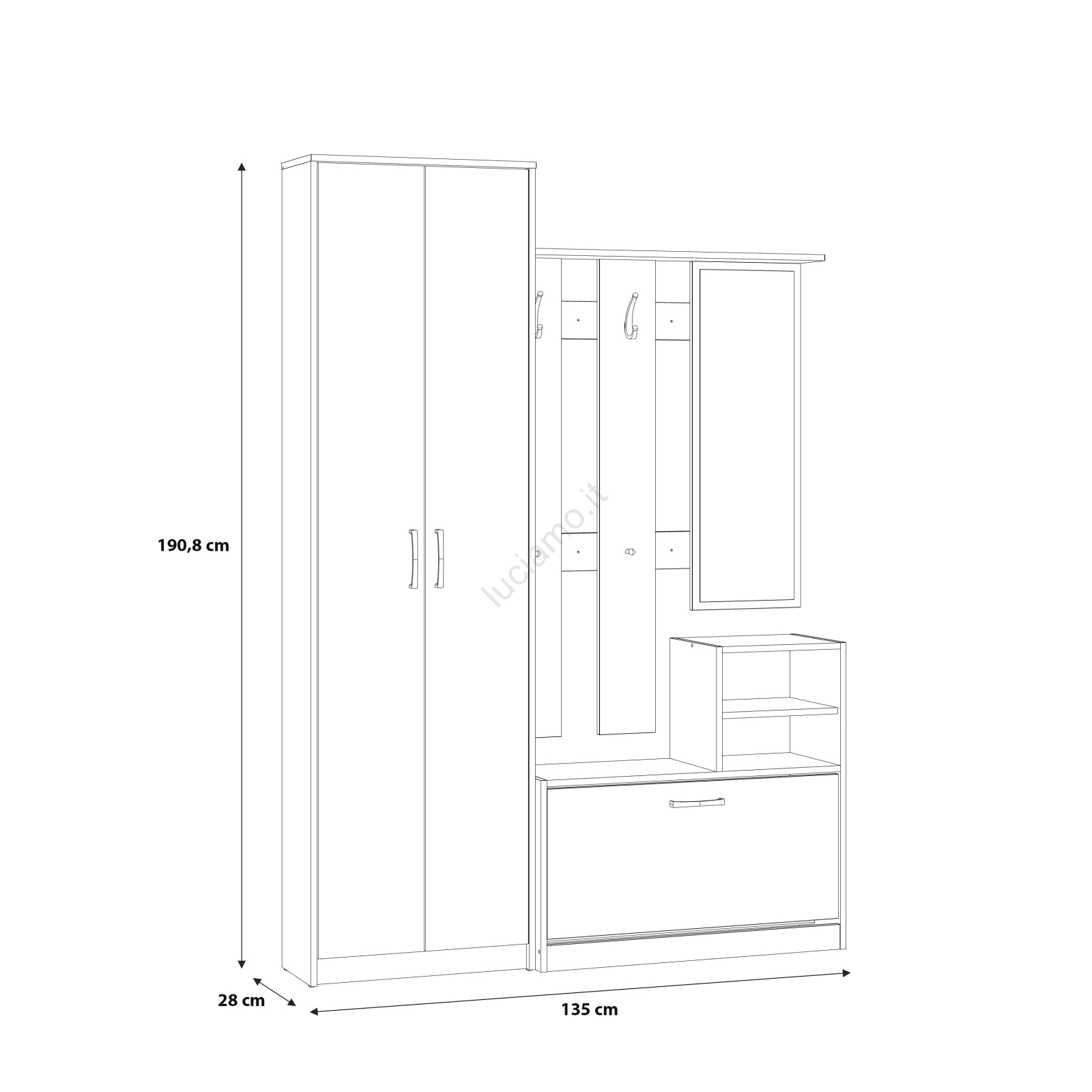 • Armadio, ripiani, scarpiera, ganci e un ampio specchio offrono esattamente ciò di cui hai bisogno.