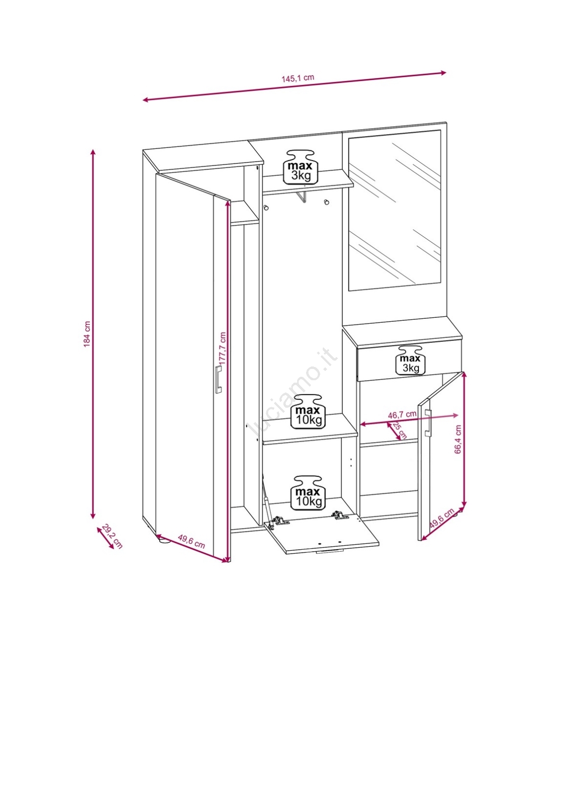 • Ripiani, ganci, barra appendiabiti e un ampio specchio offrono esattamente ciò di cui hai bisogno.