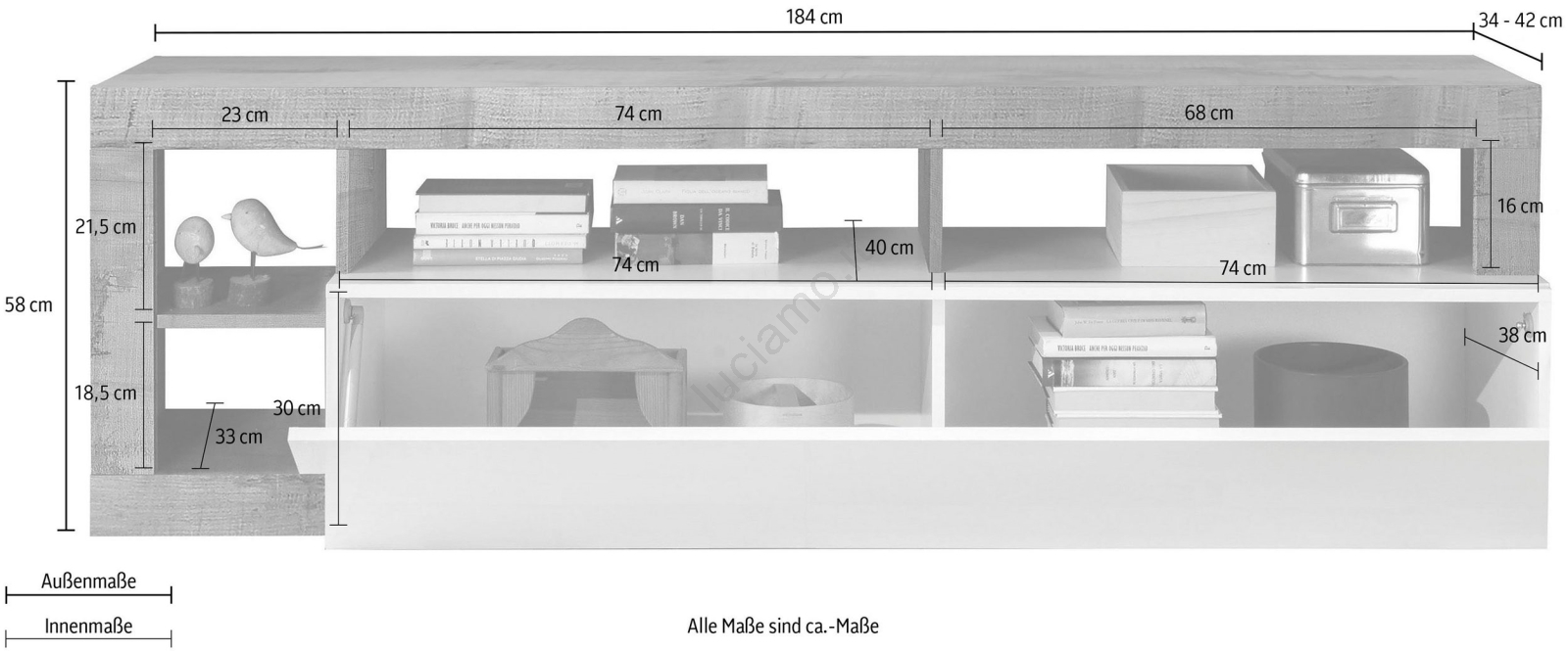 • Scomparto inferiore e ripiani aperti offrono spazio per libri, decorazioni e oggetti per la casa.