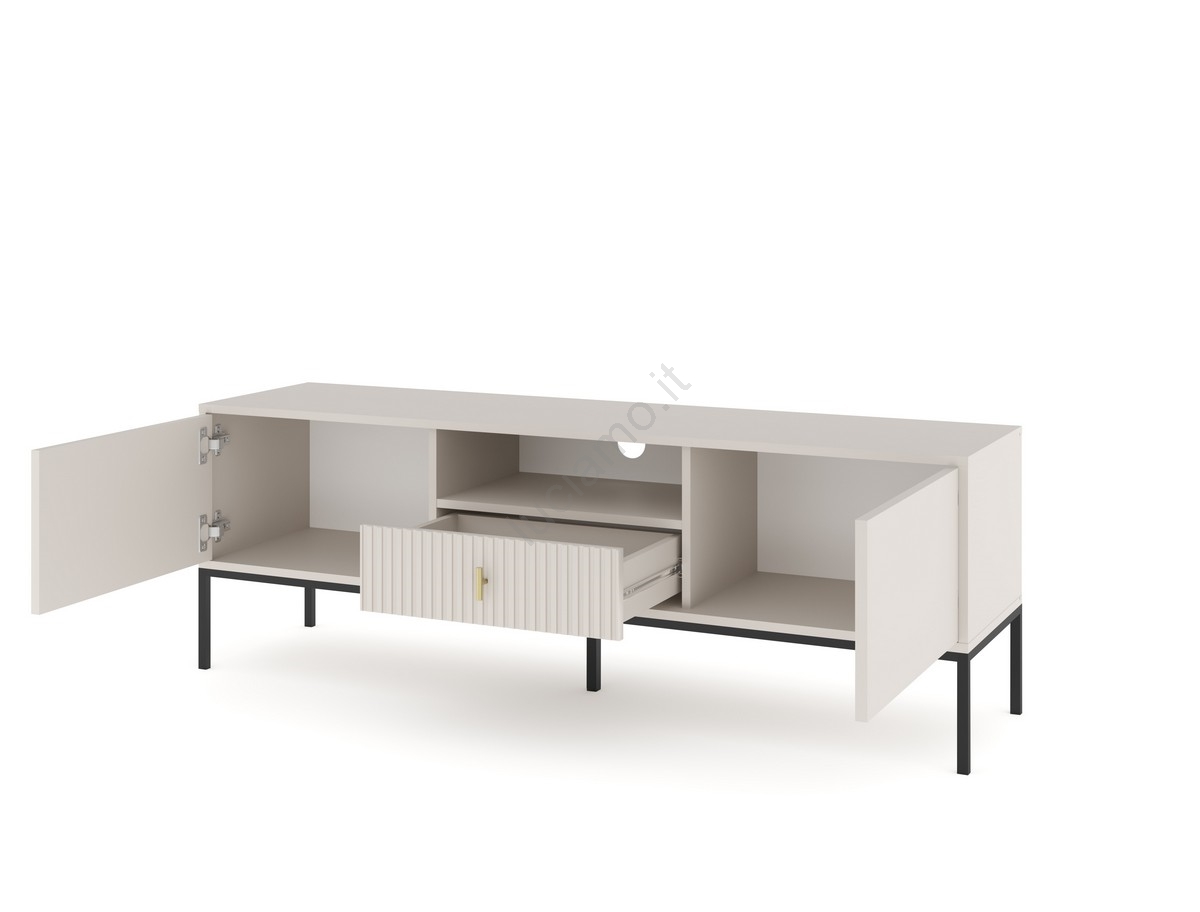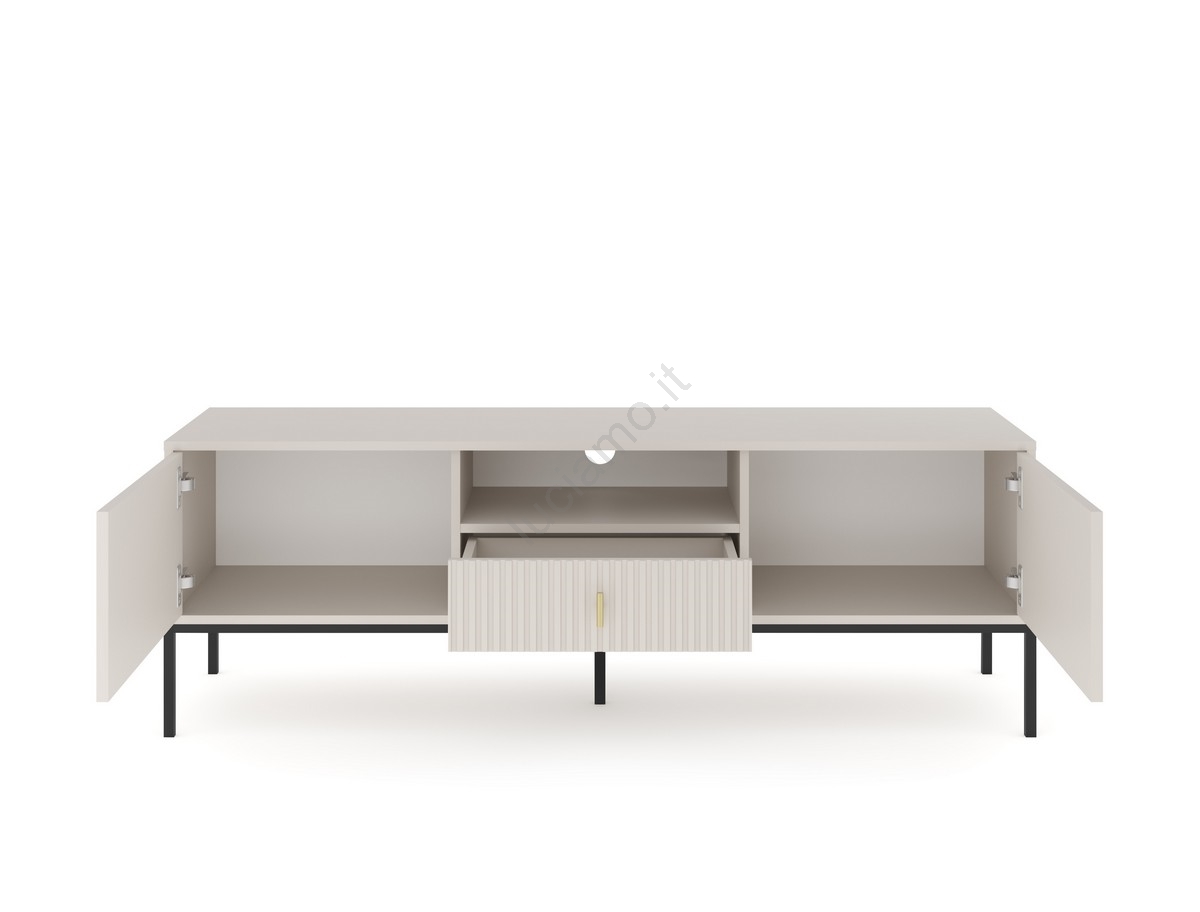 • Dispone di due scomparti laterali chiusi, di una mensola aperta con foro passacavi al centro e di un cassetto sotto la mensola con pannello anteriore a coste.