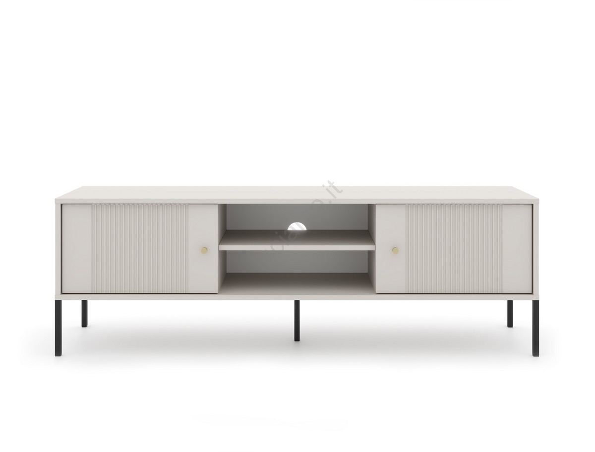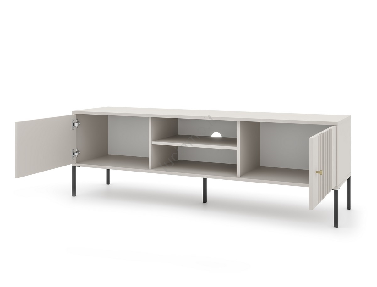 • Presenta due scomparti laterali chiusi con finitura scanalata e due ripiani aperti, uno dei quali con foro centrale per i cavi.