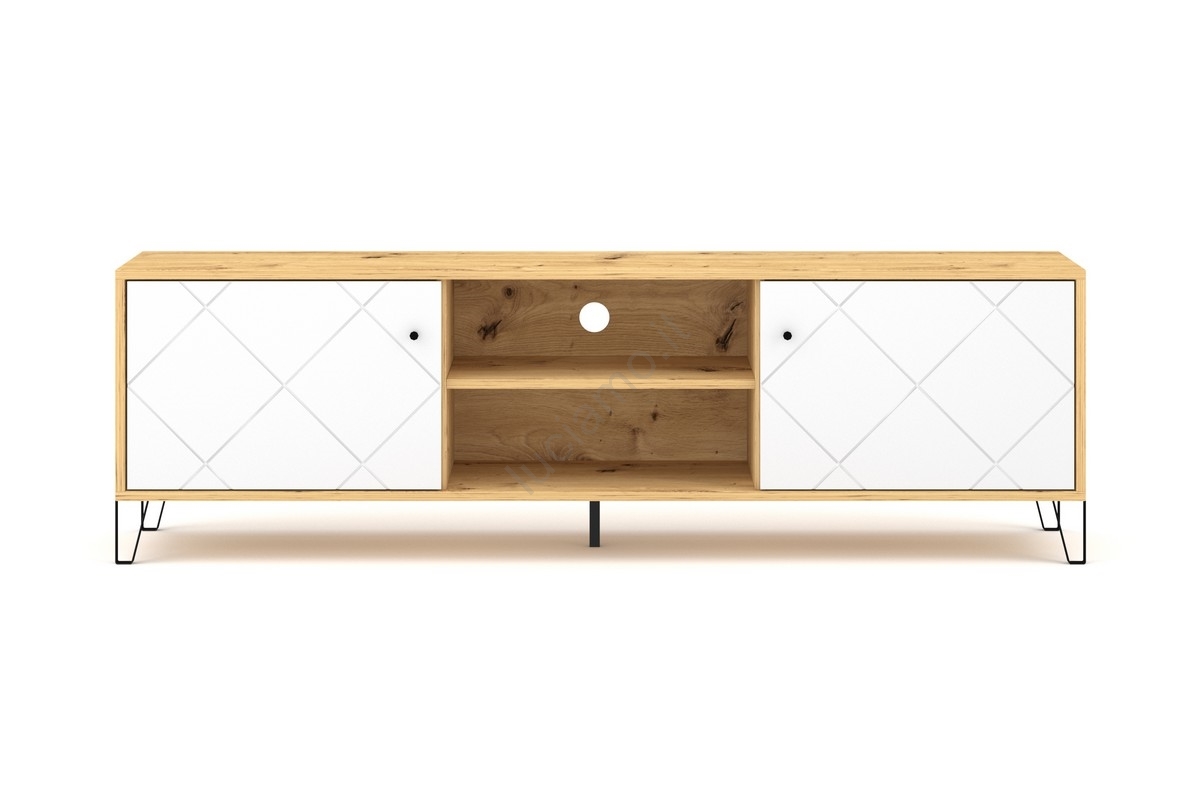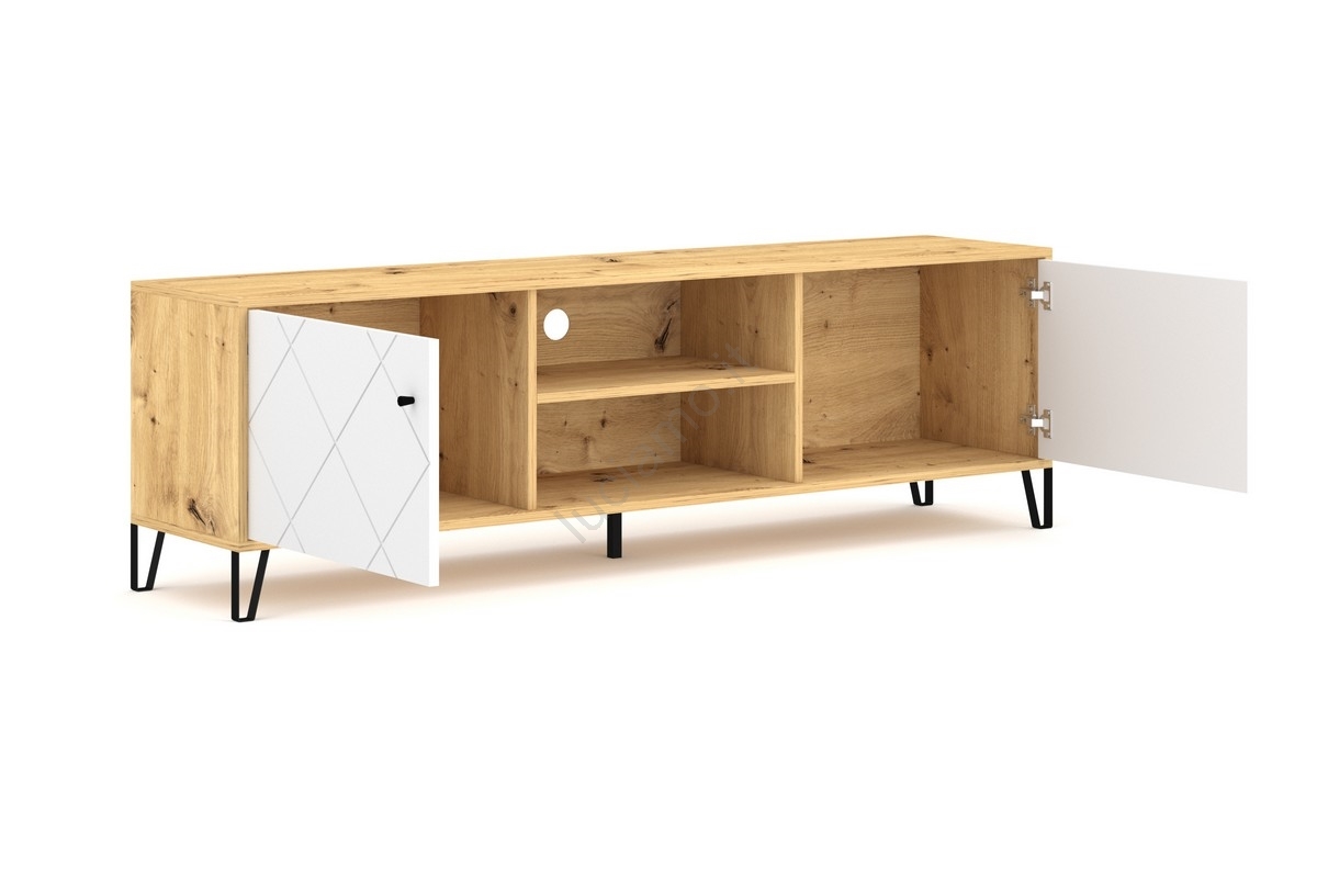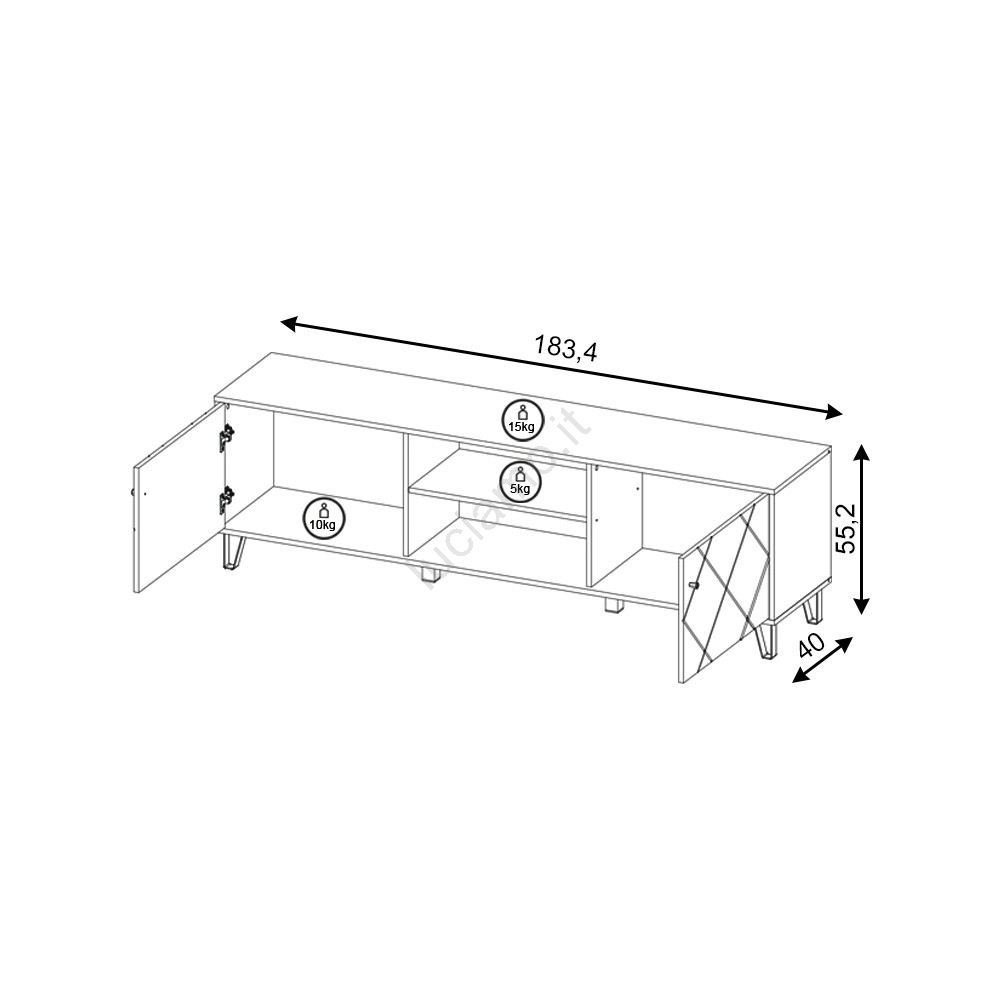 • Dispone di due scomparti laterali chiusi, ciascuno con ante dal decoro diagonale, e due ripiani aperti con foro passacavi al centro.