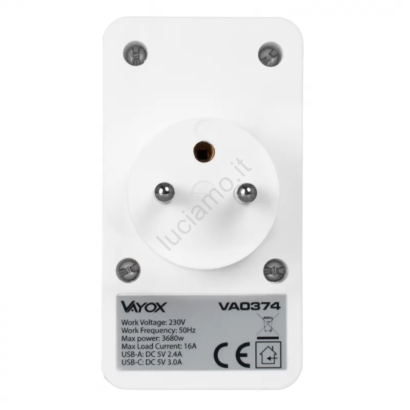 • Multipresa con 2 prese di rete + 2 porte USB-A + 2 porte USB-C.