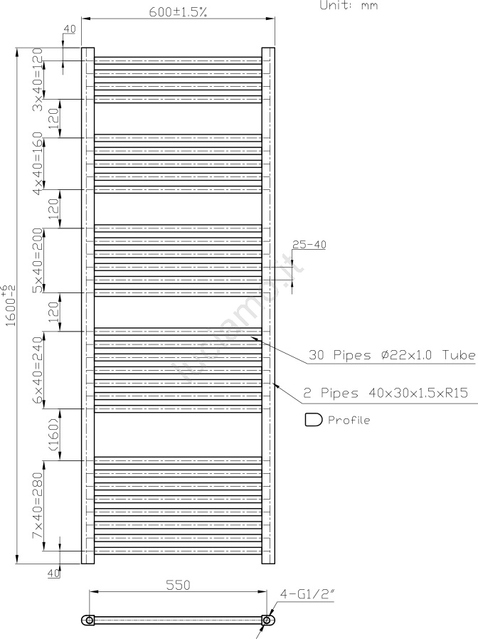 • Radiatore dritto con collegamento a 4 attacchi, rotabile.