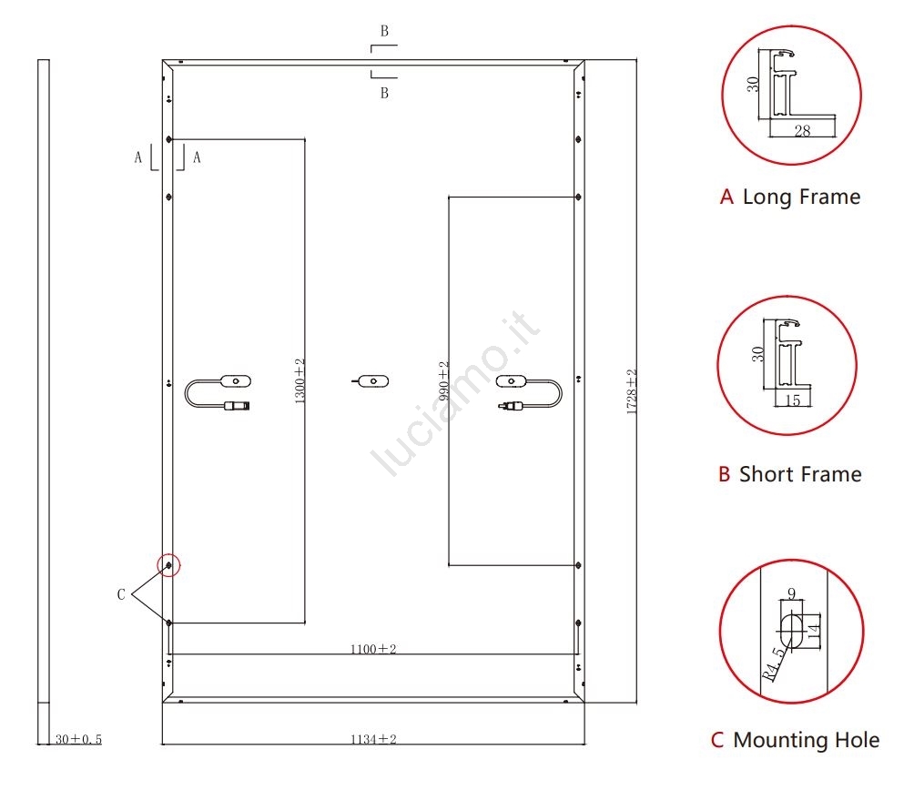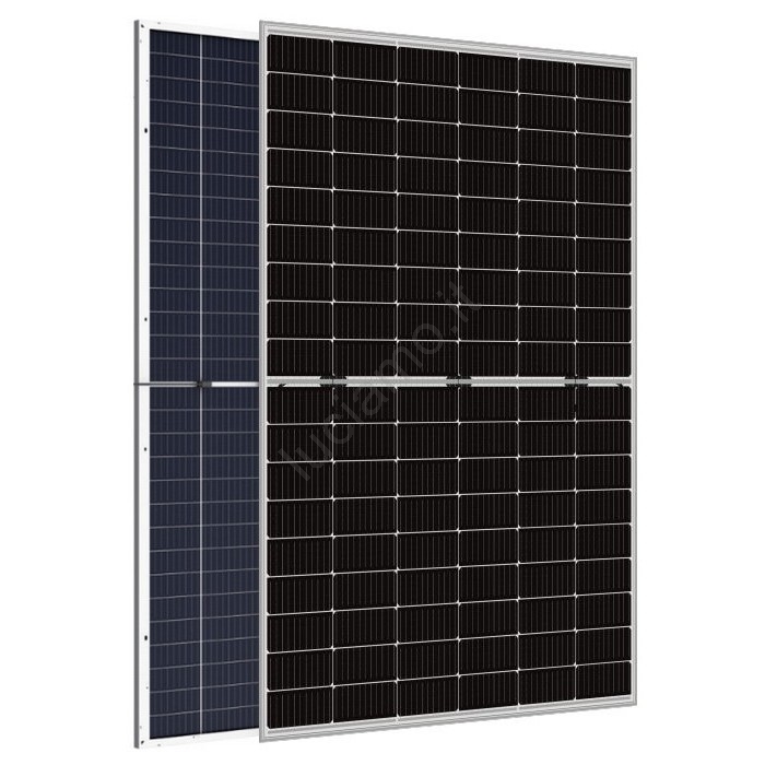 • Pannello solare fotovoltaico BIFACCIALE con cornice in alluminio argentato.