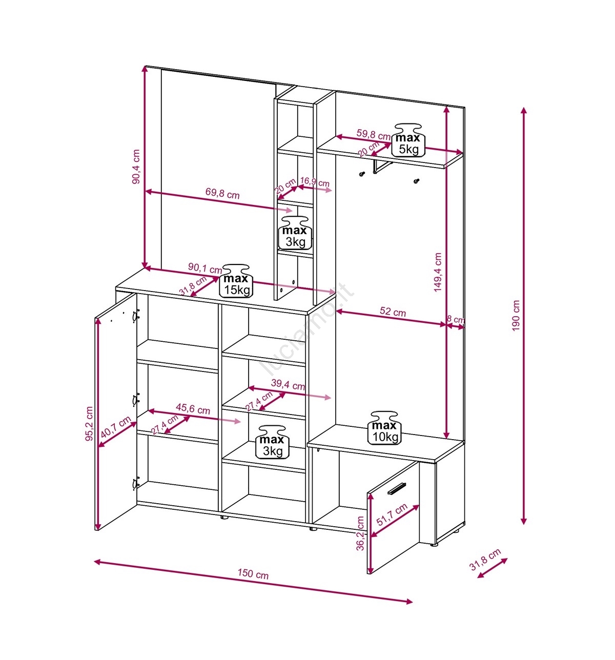 • Sotto si trovano diversi scomparti chiusi e ripiani aperti per scarpe, accessori o altri elementi di uso quotidiano.