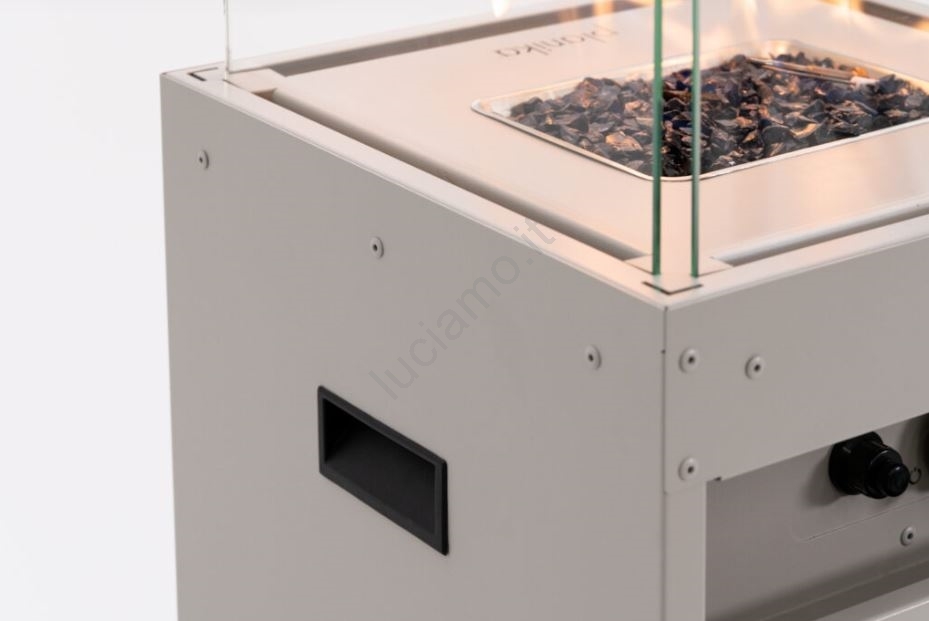 • caminetto, 4x vetri di protezione, ghiaia decorativa, 4x ruote, 1x batteria AAA, 1,4 m di tubo flessibile con diametro di 9 mm, regolatore di pressione, coperchio di protezione.