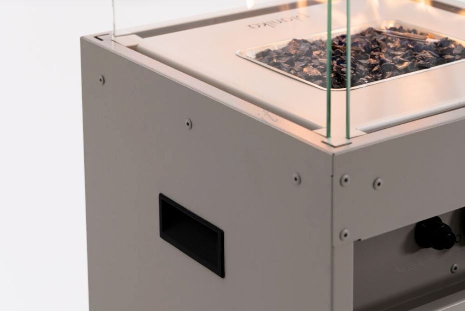 • caminetto, 4x vetri di protezione, ghiaia decorativa, 4x ruote, 1x batteria AAA, 1,4 m di tubo flessibile con diametro di 9 mm, regolatore di pressione, coperchio di protezione.