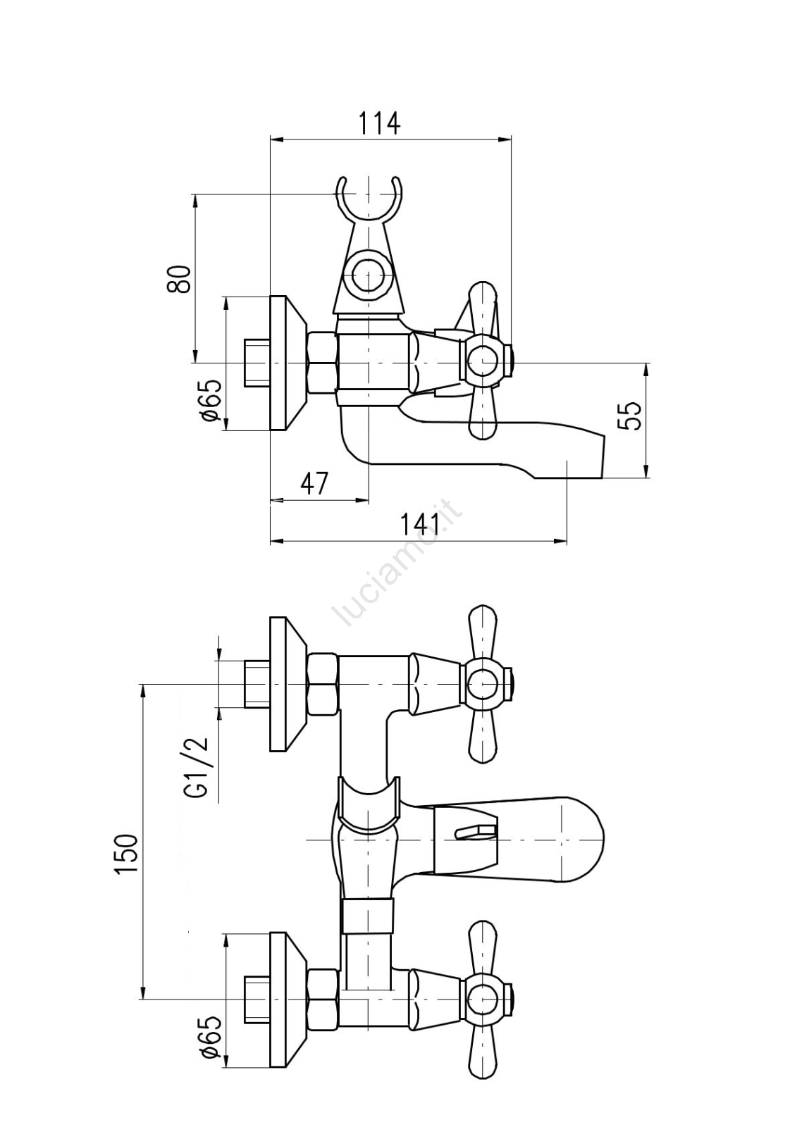 • Miscelatore da vasca da parete con deviatore in ceramica e supporto a forcella per doccetta.