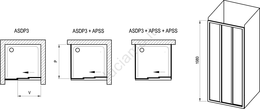 • Porte doccia a tre ante con pannelli in plastica opaca.