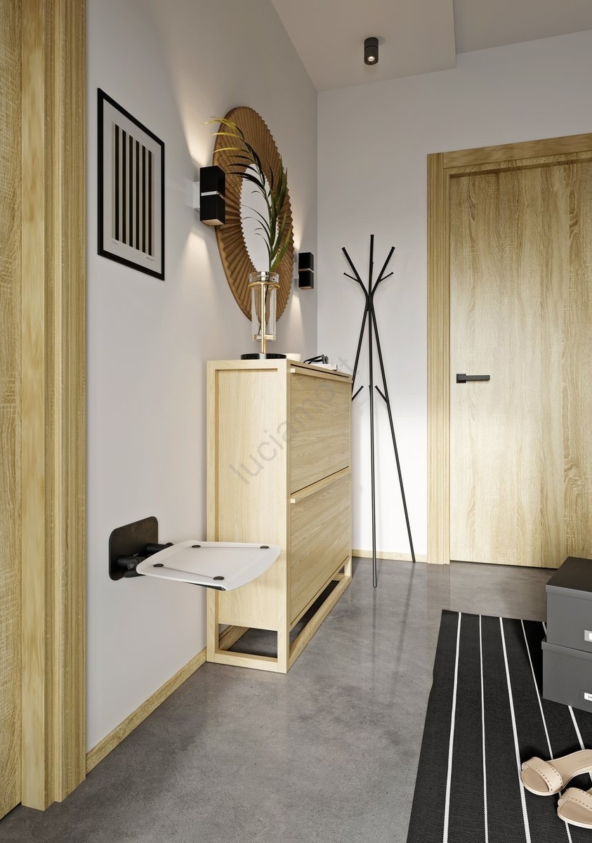 • Il sedile si ripiega facilmente contro la parete, risparmiando spazio e mantenendo libertà di movimento sotto la doccia.