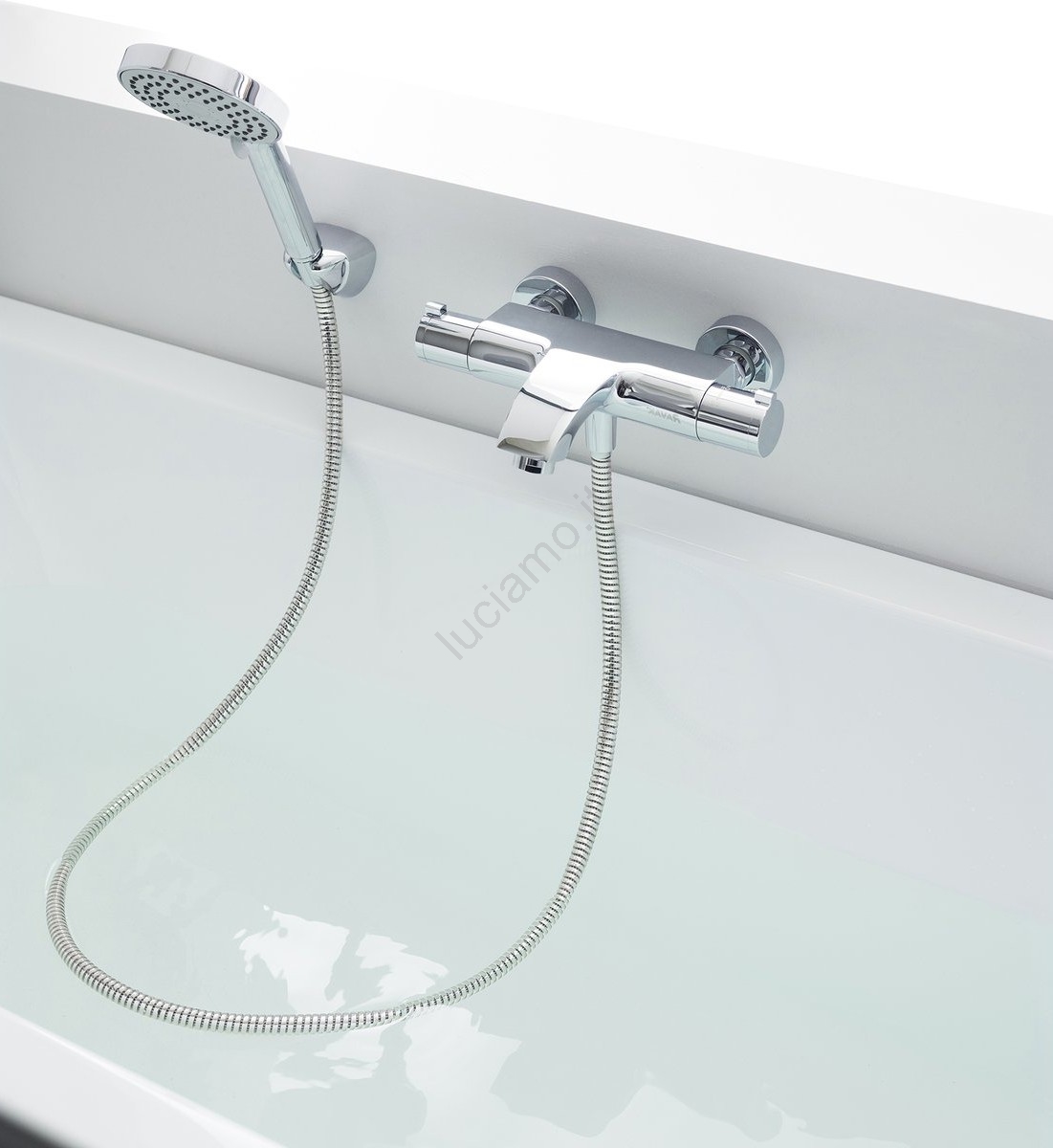 • Miscelatore termostatico da parete per vasca che mantiene costante la temperatura dell'acqua e garantisce un riempimento della vasca sicuro e confortevole.