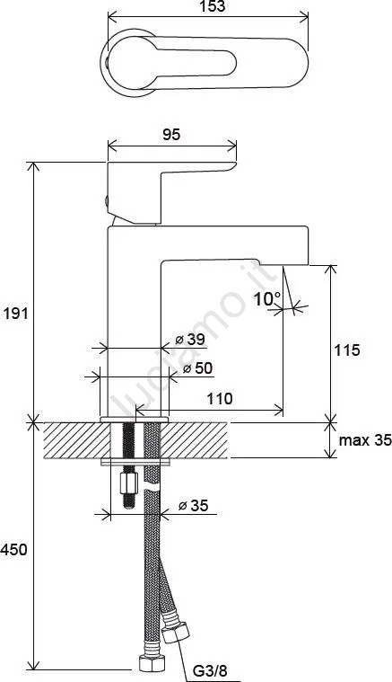 • Il miscelatore è fornito senza scarico e comprende tubi flessibili di collegamento della lunghezza di 400 mm con attacchi G3/8.