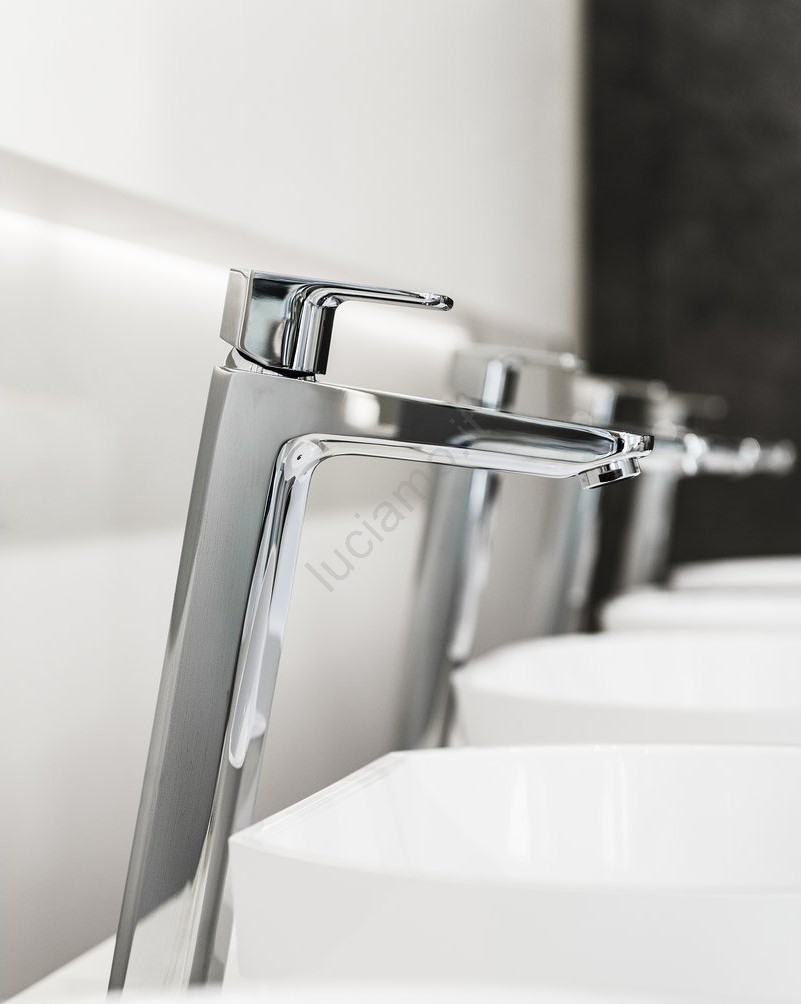 • Il miscelatore per lavabo Free nella finitura cromata lucida ha un'altezza extra prolungata di 334 mm, ideale per lavabi da appoggio.