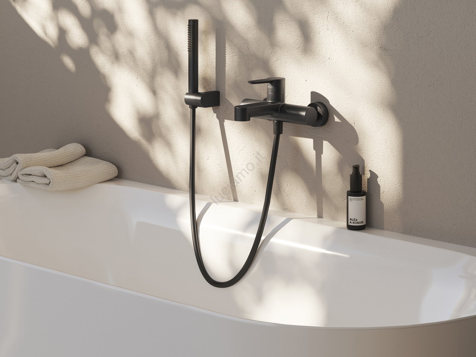 • Miscelatore monocomando per vasca con leva in finitura nera.