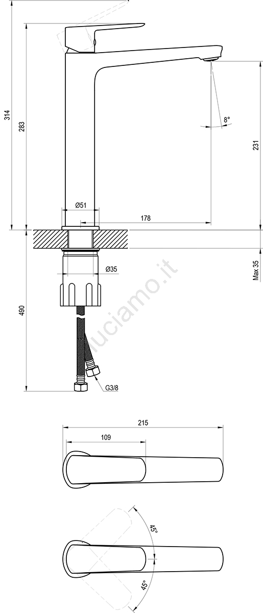 • Il miscelatore è fornito senza piletta e include tubi flessibili di collegamento della lunghezza di 450 mm con attacco G3/8.