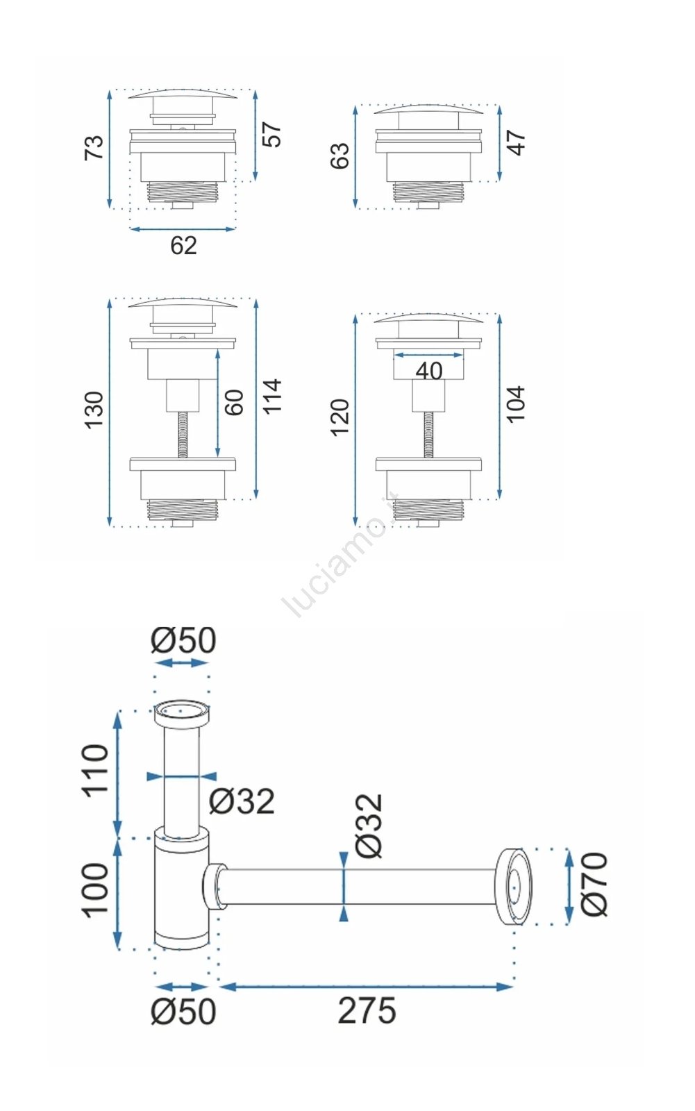 • Sifone in ottone di alta qualità con scarico universale per lavabo con sistema CLICK-CLACK.