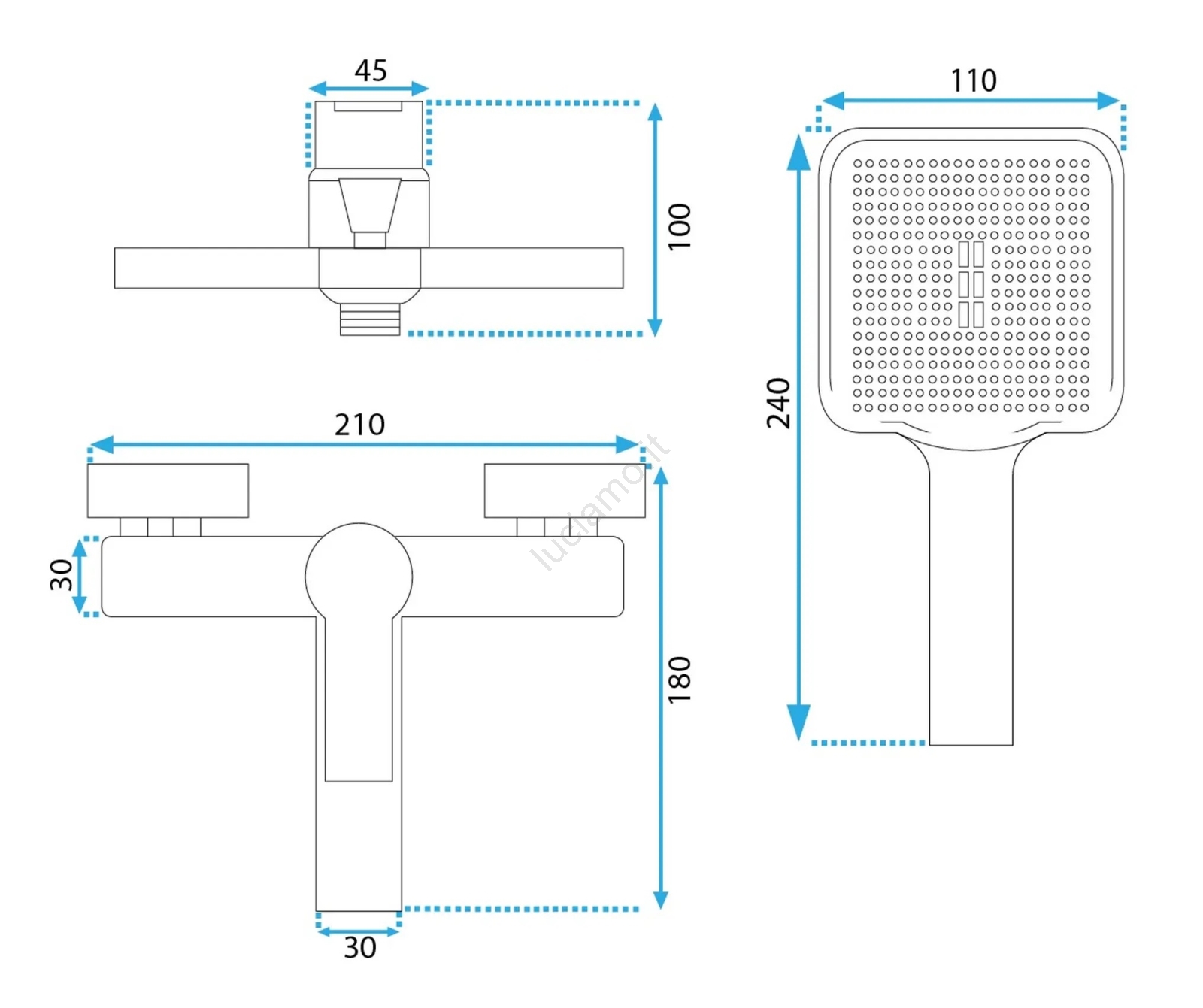 • La confezione comprende: miscelatore per vasca, doccetta, flessibile per doccia, supporto per doccetta.
