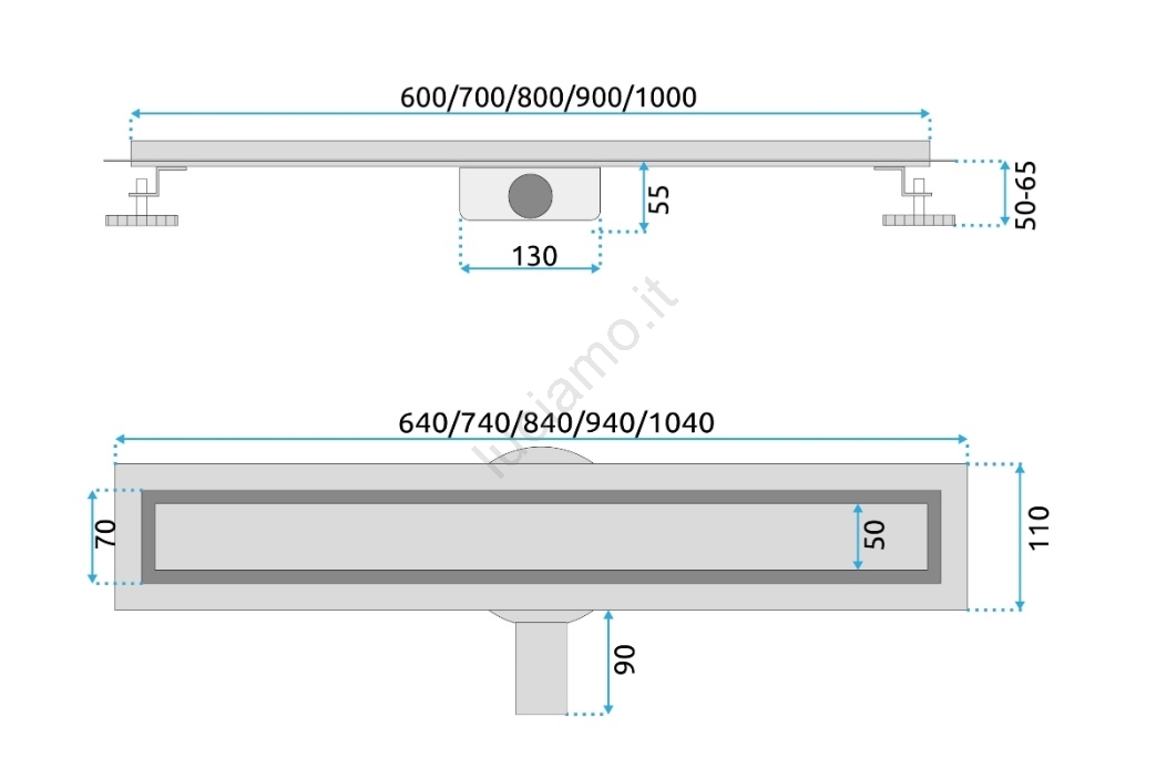 • Grazie ai piedini regolabili in altezza (50–65 mm) lo scarico può essere facilmente adattato a diverse condizioni del pavimento.