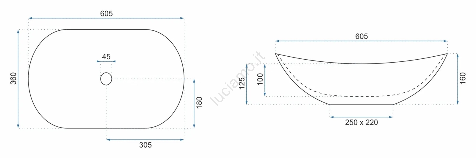 • Lavabo moderno ed elegante senza troppopieno.