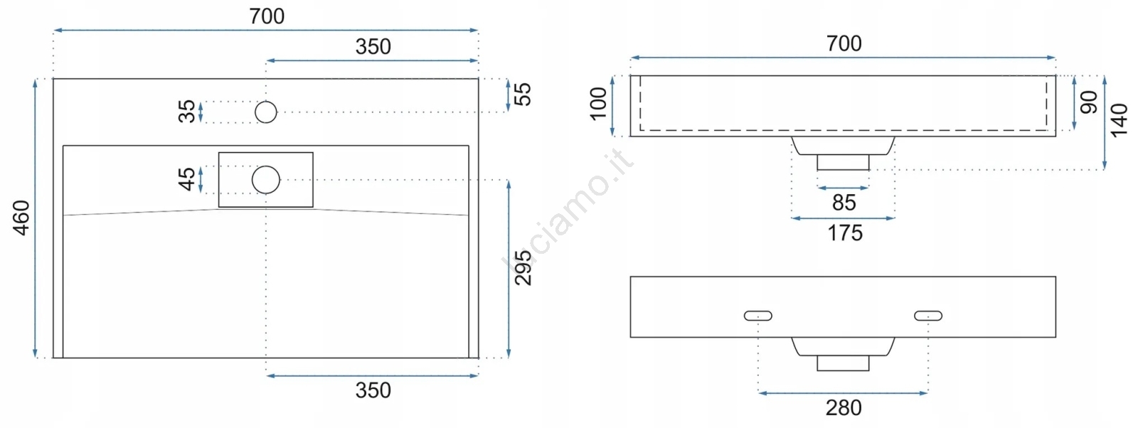 • Il lavabo può essere sospeso o montato direttamente sul piano.