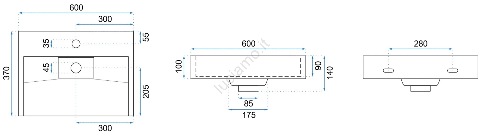 • Il lavabo può essere sospeso a parete o montato direttamente sul piano.