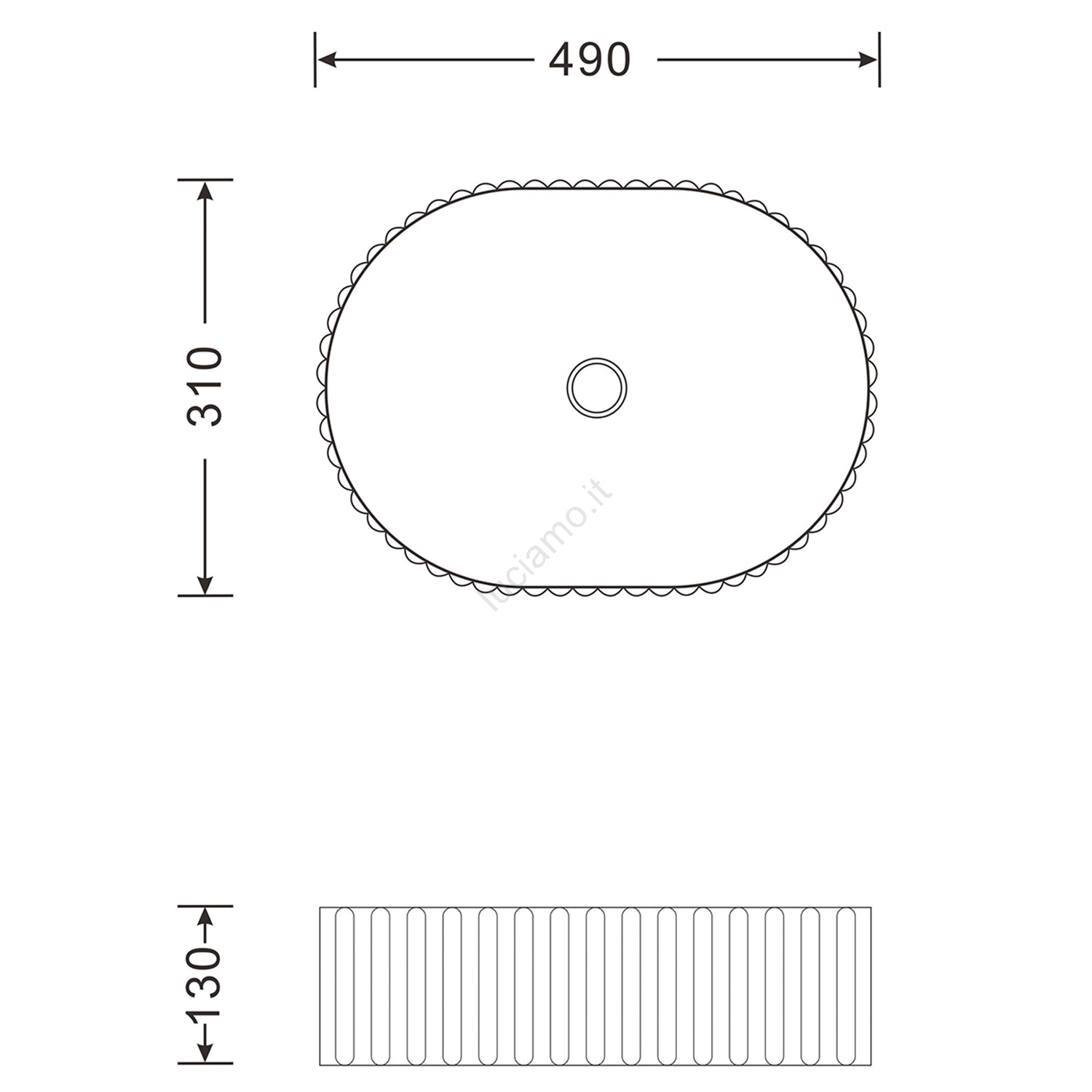 • Le sue dimensioni sono 490x310 mm e l'altezza è di 130 mm.
